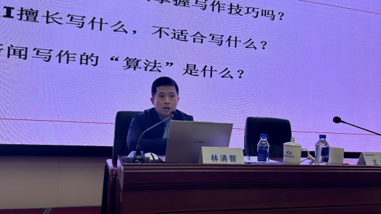 本次活动邀请了福建日报时政新闻部记者林清智作《新闻写作中的“常量”》主题分享。林清智立足新闻传播学专业知识,结合十多年新闻从业经验与心得体会,围绕新闻写作业务实际情况展开阐述,运用案例详细解读了新闻写作需要遵循的基本原则,还特别强调了“语言具体化”的新闻写作行文技巧。