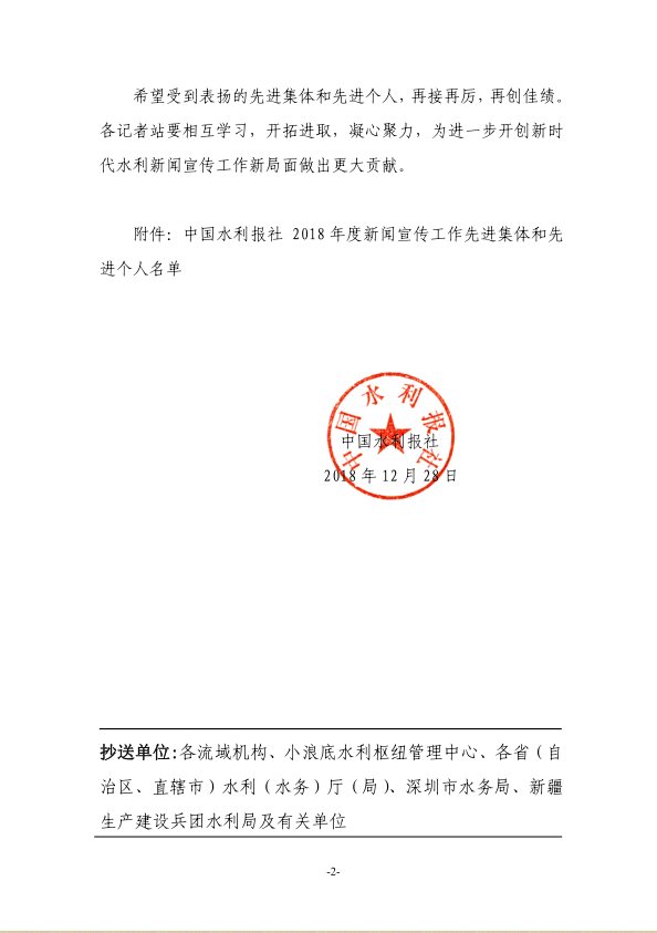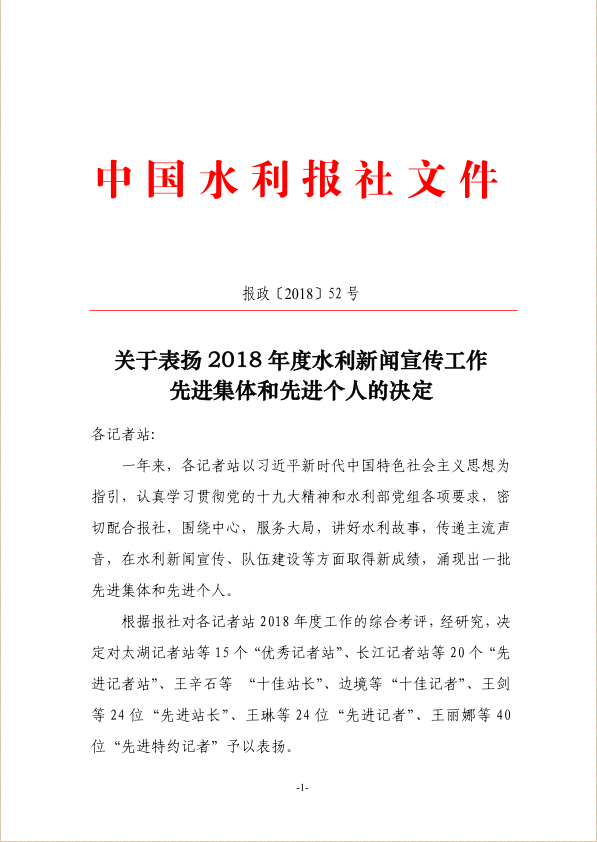 近日,中国水利报社通报表扬2018年度水利新闻宣传工作先进集体和先进个人,我省水利新闻宣传工作获多项荣誉,老王论坛 一名新闻信息宣传负责同志被评为“先进特约记者”。