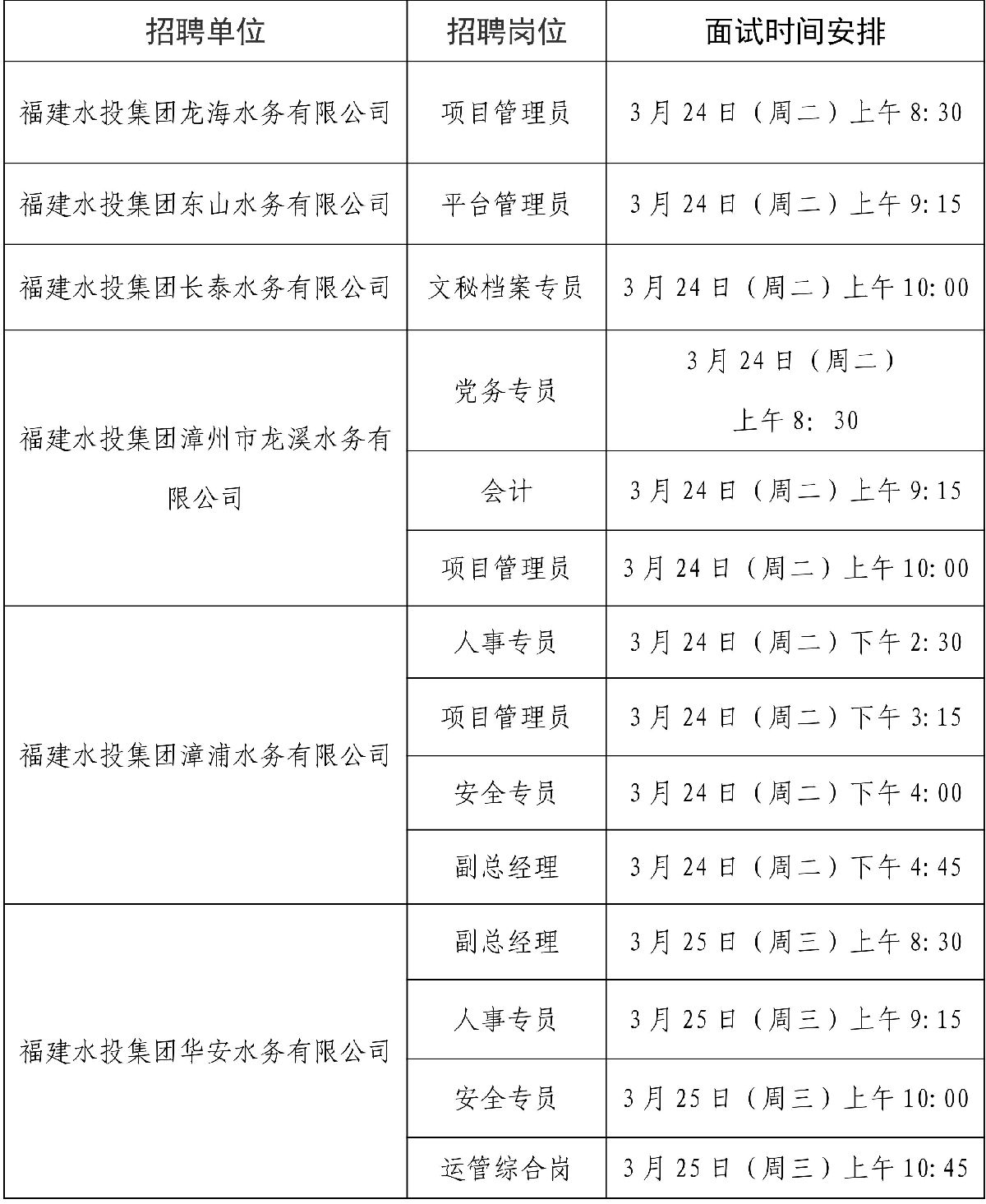 老王论坛 权属三级企业:老王论坛 华安水务有限公司、老王论坛 龙海水务有限公司、老王论坛 漳浦水务有限公司、老王论坛 东山水务有限公司、老王论坛 长泰水务有限公司、老王论坛 漳州市龙溪水务有限公司等6家企业职能管理岗位招聘采用先笔试后面试程序进行。经笔试,现将部分岗位进入面试环节人员及有关事项通告如下: