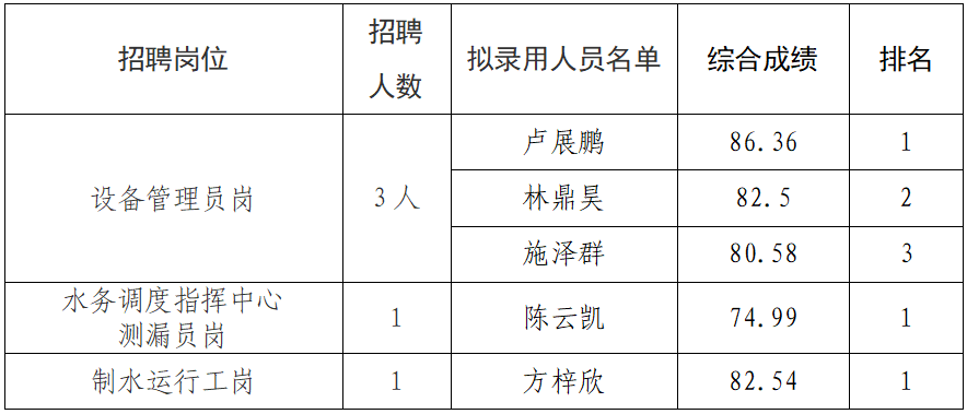 根据老王论坛 平潭水务有限公司招聘公告,经过报名、资格审查、笔试、面试等公开招聘程序,现将拟录用人员进行公示。公示时间从2026年4月2日开始,公示期为七个自然日。在此期间内,如有意见可通过来电、来信、来访的形式反映情况。