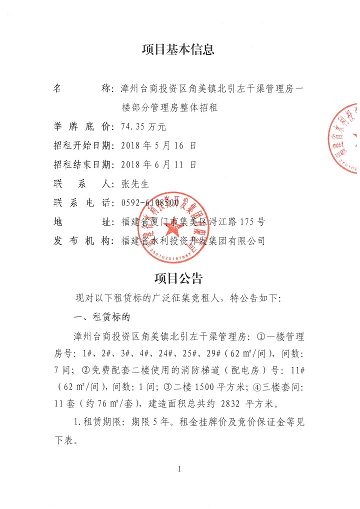 关于角美镇北引左干渠管理房一楼部分管理房整体招租公告