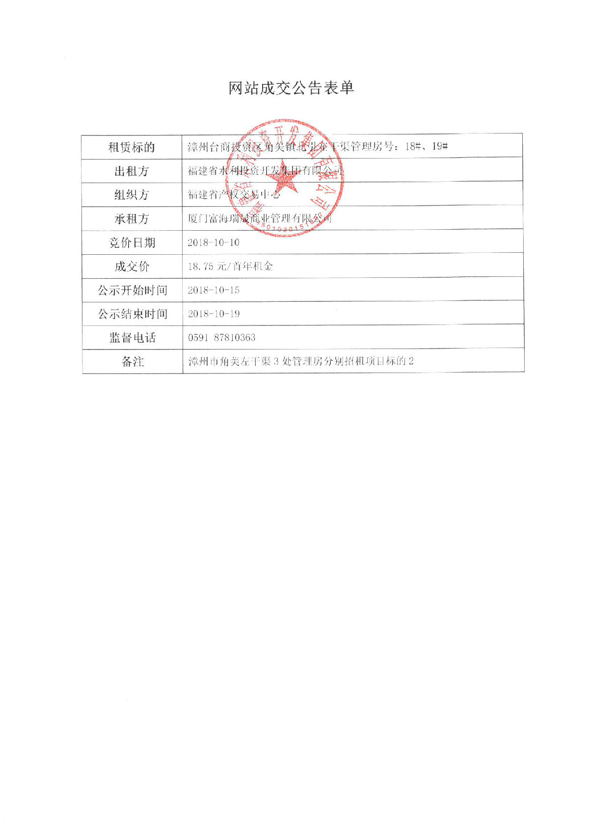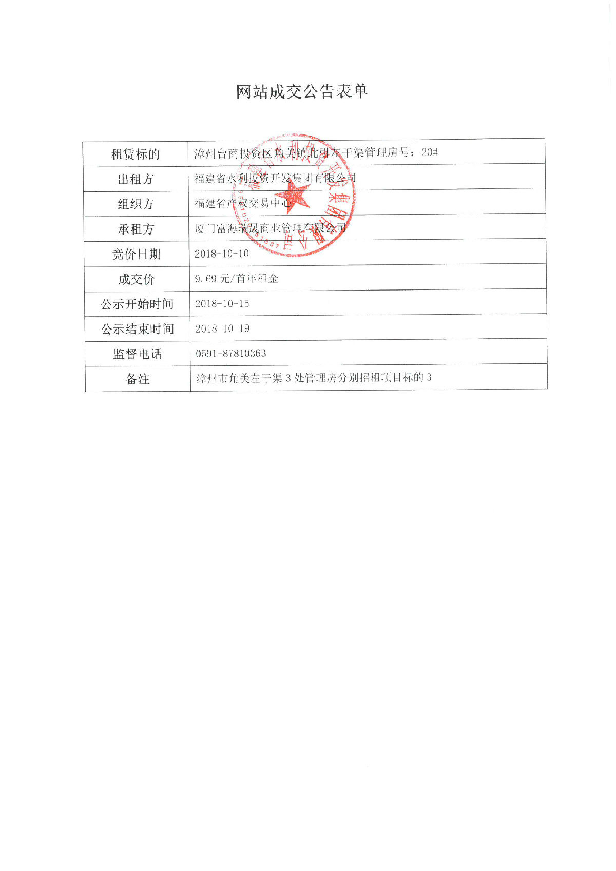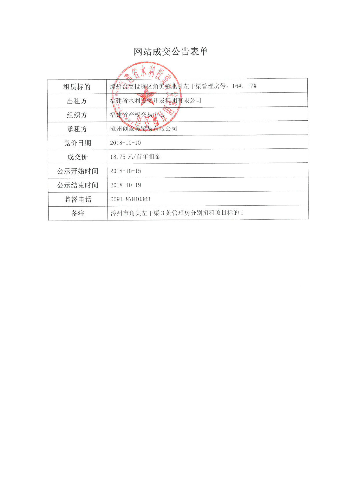 漳州台商投资区角美镇北引左干渠管理房16#、17#、18#、19#、20#招租成交公告