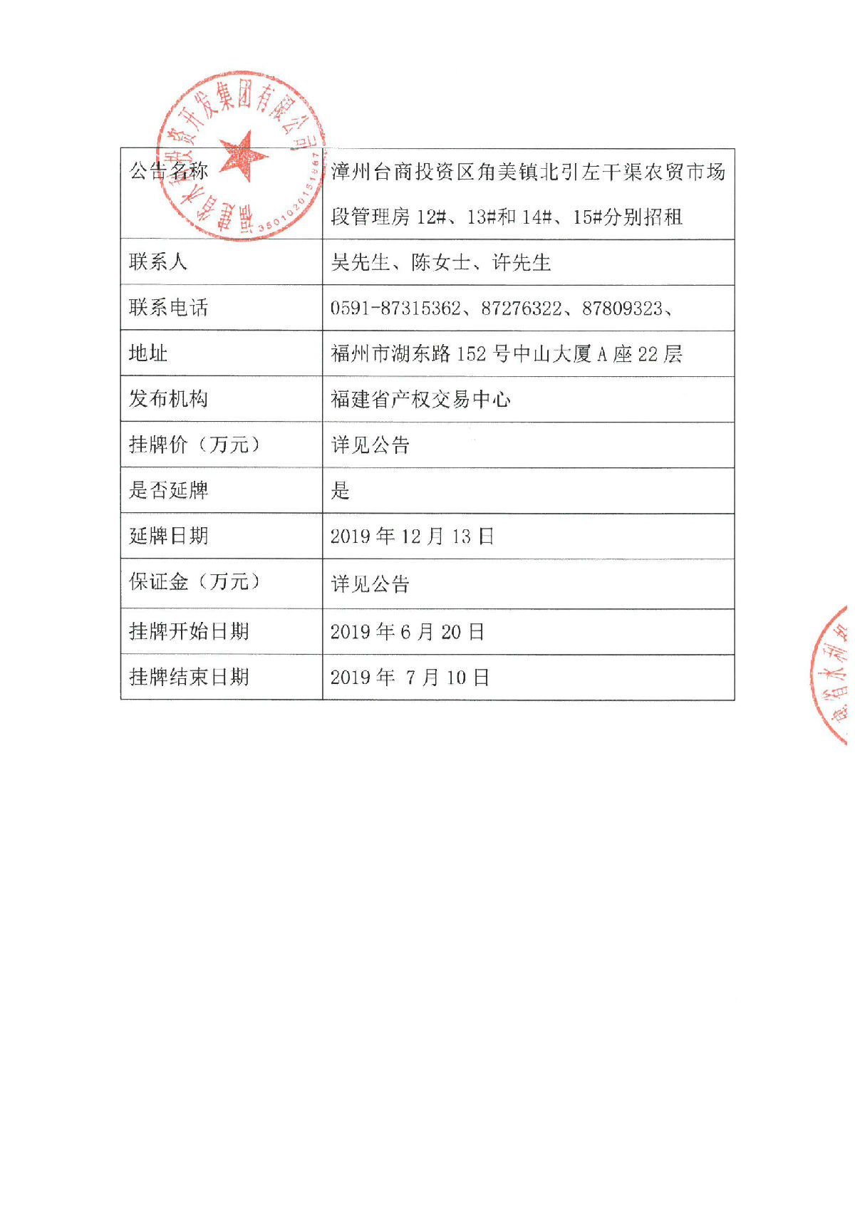 漳州台商投资区角美镇北引左干渠农贸市场段管理房12#、13#和14#、15#分别招租公告